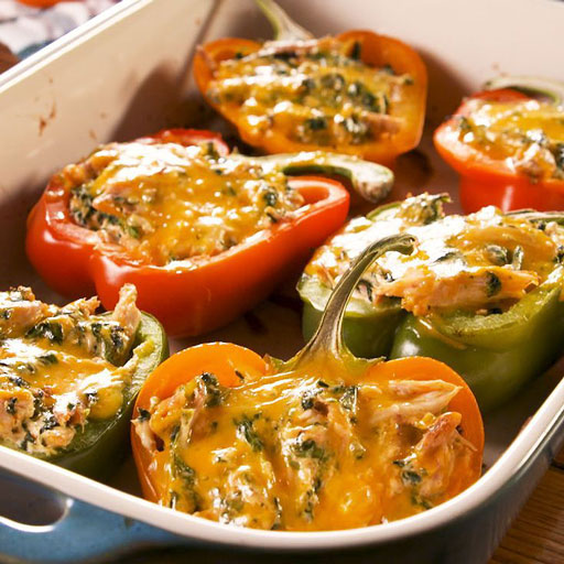 Kuumenna uuni 180 °C:een. Paista paprikoita 30–35 minuuttia, kunnes ne ovat pehmeitä. Juuston tulee sulaa ja muodostaa kullanruskea pinta.